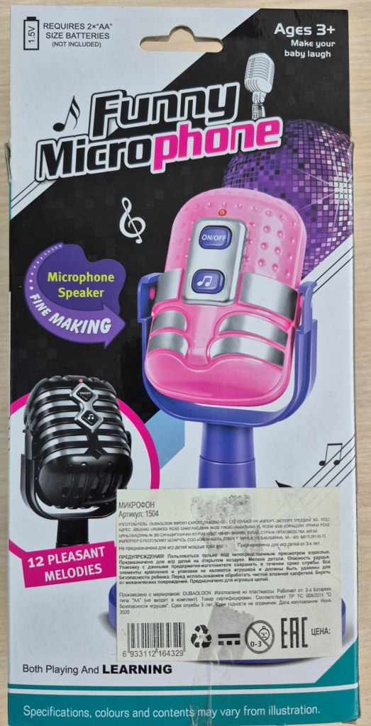 Игрушка детская «Микрофон» с маркировкой «OUBAOLOON» артикул 1504, для детей старше 3-х лет, изготовитель «OUBAOLOON IMPORT-EXPORT TRADING CO., LTD.» (Китай) запрещена Госстандартом к ввозу и обращению на территории Республики Беларусь, по несоответствию требованиям технического регламента Таможенного союза ТР ТС 008/2011 «О безопасности игрушек» по показателю гигиенической безопасности – завышенному эквивалентному уровню звука. Кроме того, проконтролированному в г.Глубокое индивидуальному предпринимателю и поставщику игрушек выдано предписание об изъятии (отзыве из обращения) небезопасной продукции.