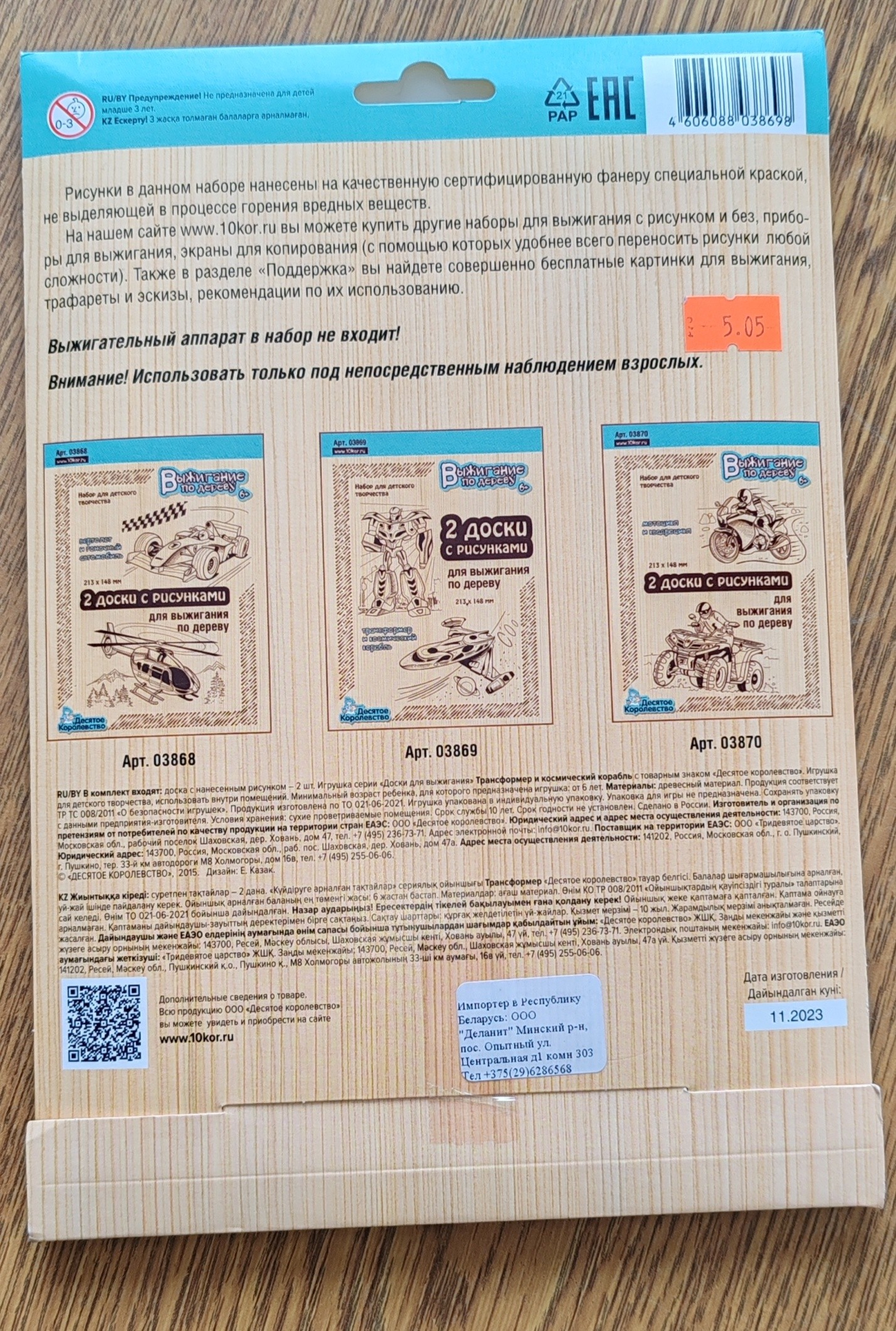 Госстандартом предписан запрет ввоза и обращение на территории Республики Беларусь игрушек серии «Доски для выжигания», Трансформер и космический корабль с товарным знаком «Десятое королевство», артикул 03869, импортеру и проверенному индивидуальному предпринимателю предписано изъять из обращения вышеуказанную продукцию.