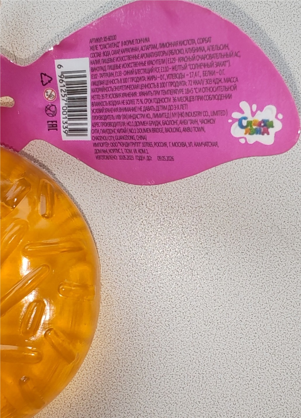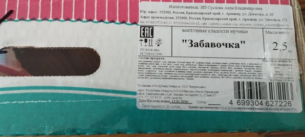 бензойная кислота (Е210) в восточных сладостях мучных «Забавочка», весовые, изготовитель ИП Суслова А.В. г. Армавир, а также обнаружены синтетические красители: тартразин (Е102), желтый «солнечный закат» FCF (Е110) с отсутствием в маркировке предупреждающей надписи: «содержит краситель, который может оказывать отрицательное влияние на активность и внимание детей».