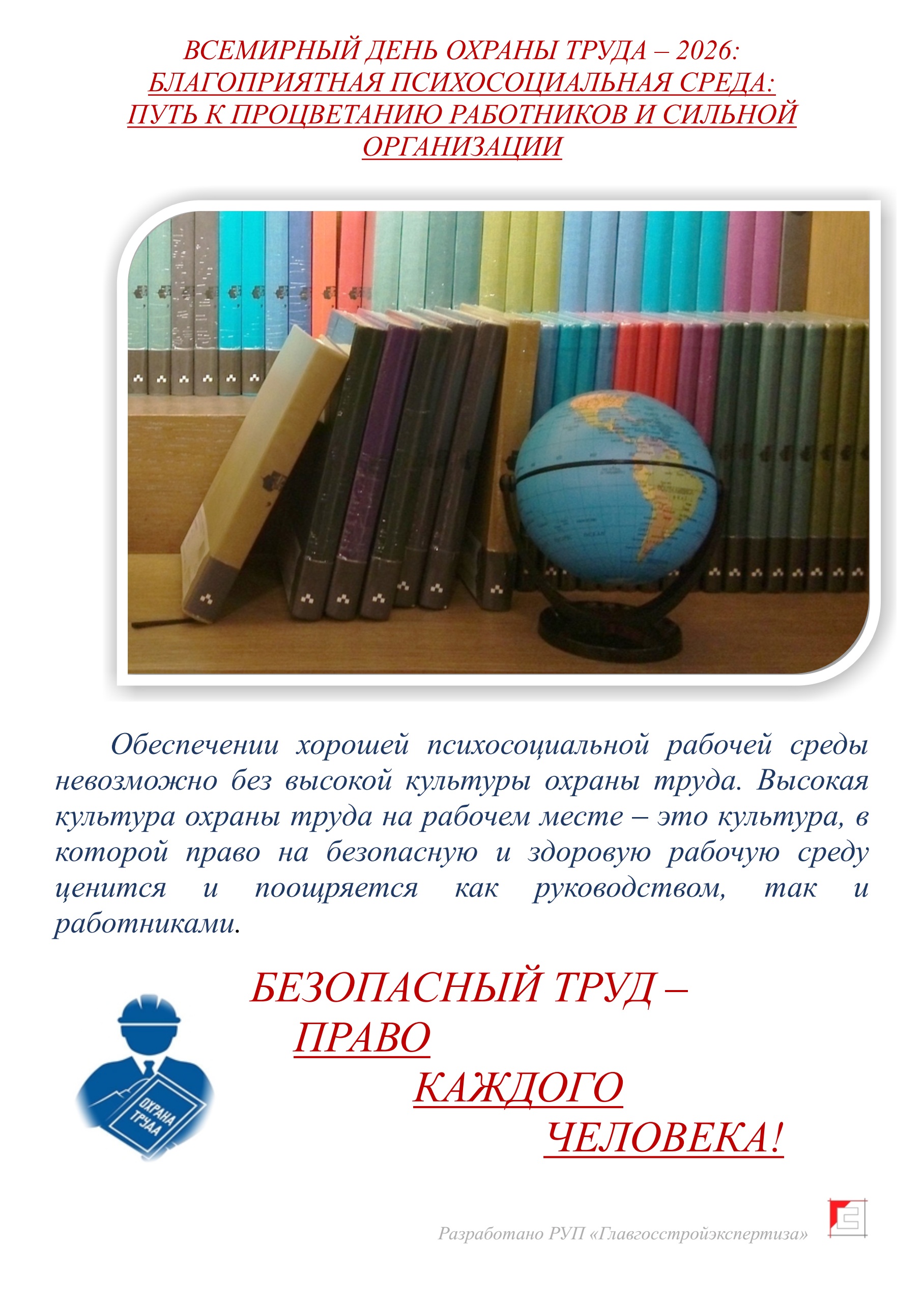 Тема Всемирного дня охраны труда в 2026 году: «Благоприятная психосоциальная рабочая среда: путь к процветанию работников и сильной организации». Психосоциальная рабочая среда оказывает большое влияние на здоровье и благополучие работников. Работники, испытывающие стресс на работе, могут нажить себе серьезные проблемы с психическим и физическим здоровьем. Это, в свою очередь, может негативно повлиять на состояние организации и общества в целом.